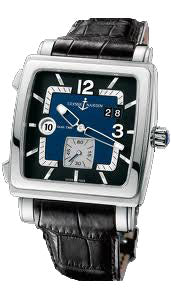 QUADRATO DUAL TIME SW QUICK SETR BIGDATE SS CASE WR 50M CENTER BLUE W BLK DIAL ARABIC FIGURES ALLIGATOR BLK STRAP
