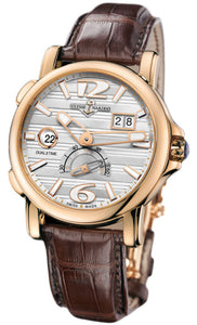 MAXI GMT DUAL TIME 34 JEWEL SW QS BIG DATE 18K RG 42MM WR 100M SIL DIAL W ARABIC FIGURES BROWN ALLIGATOR STRAP